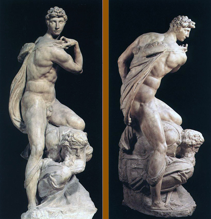 ). Микеланджело считал скульптуру выдающимся искусством и даже в живописи лепил человеческие формы. С созданием культовой статуи Давид (1501-1504) закрепилась его репутация скульптора, чьи работы олицетворяют собой Высокое Возрождение. Дэвид получил центральное место в городе Флоренция, поддерживая дух города-государства по защите своих гражданских свобод.