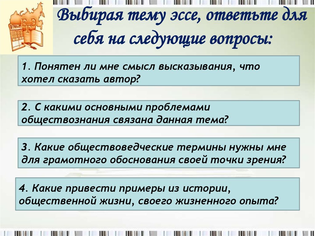 - Эссе — это то, как сотрудники приемной комиссии узнают о вашей личности, точке зрения и уровне зрелости, поэтому правильное определение темы является ключевым фактором, позволяющим им видеть вас как осведомленного, самостоятельного, непредубежденного кандидата, который собирается процветать в условиях независимости.