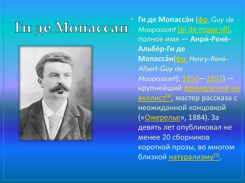 Ги де Мопассан – известнейший новеллист французского происхождения, поэт и рассказчик историй с неожиданной концовкой.