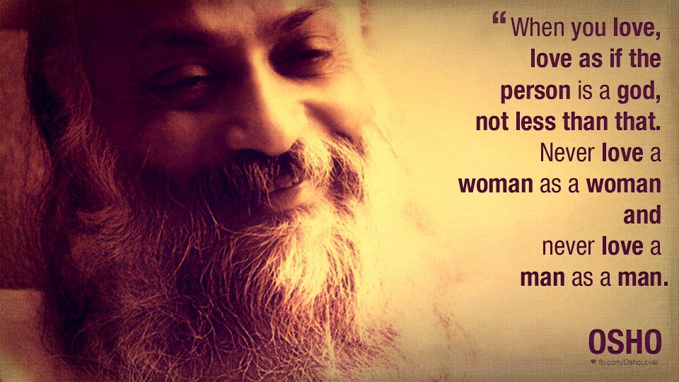 «Вот почему я весь за любовь, потому что из любви очень легко привести тебя к медитации, привести тебя к вечности твоей жизни, привести тебя к твоему благочестию; с головы очень тяжело. Сначала человек должен прийти к сердцу, и только тогда он сможет двигаться к bein g». 4 «Женское освобождение автоматически означает мужское освобождение. Женское рабство автоматически становится мужским рабством. Они идут вместе». 5
