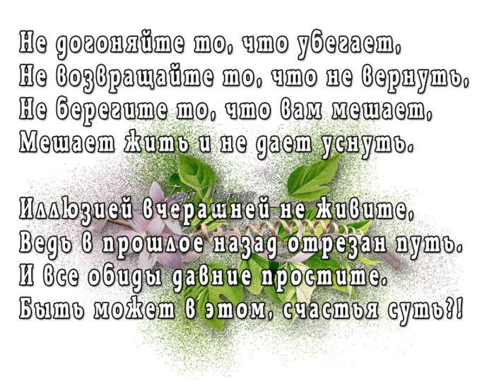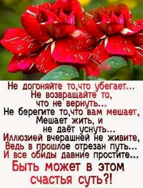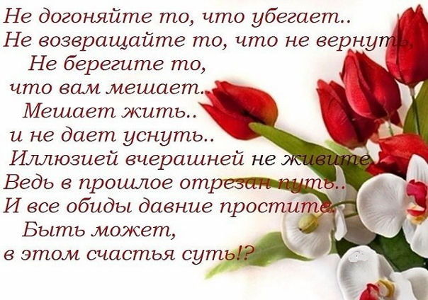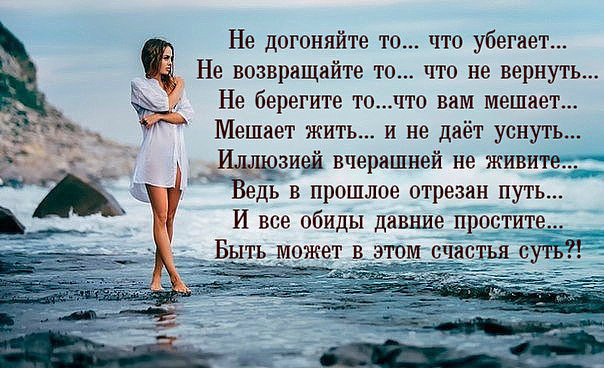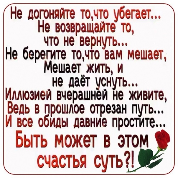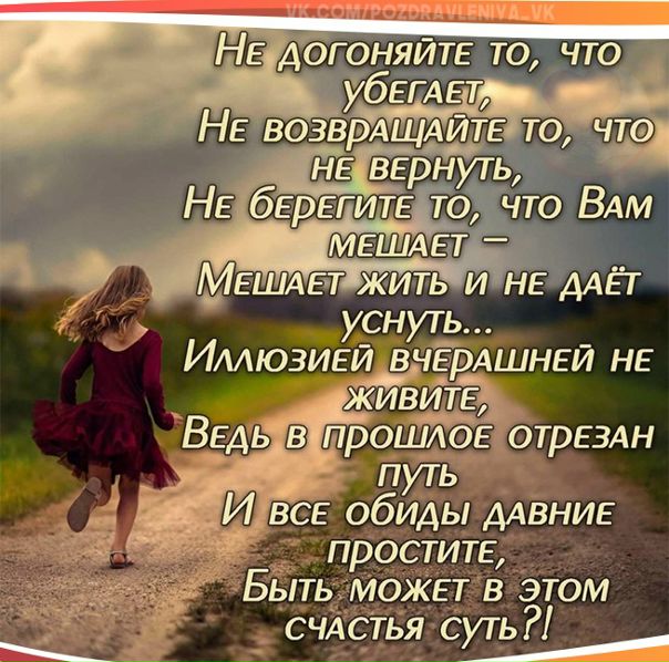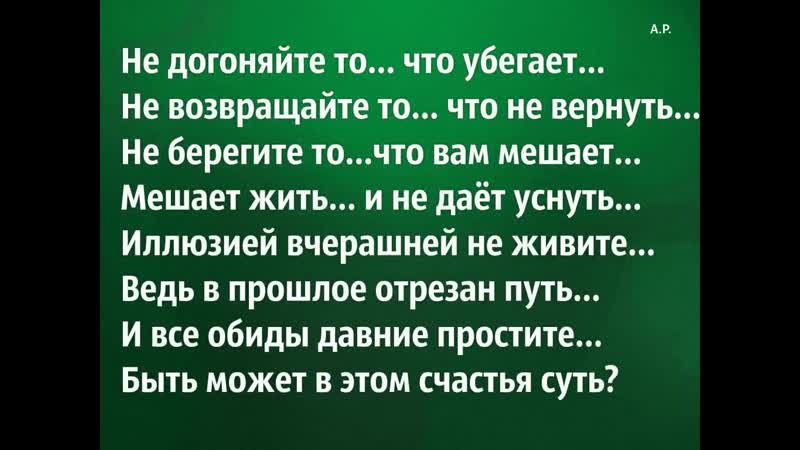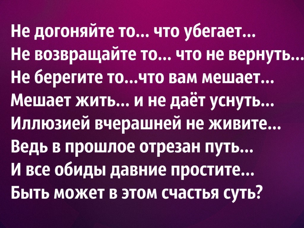 Не догоняйте то, что убегает… Не возвращайте то, что не вернуть… Не берегите то, что вам мешает… Мешает жить и не даёт уснуть… Иллюзией вчерашней не живите… Ведь в прошлое отрезан путь… И все обиды давние простите… Быть может в этом счастья суть?!