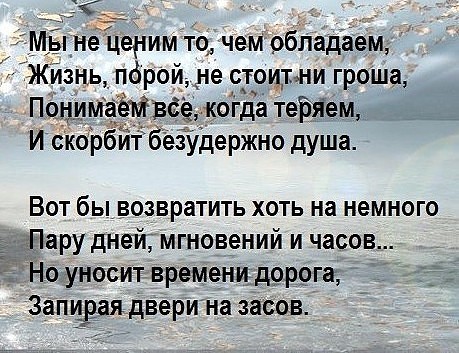 Не догоняйте то, что убегает… Не возвращайте то, что не вернуть… Не берегите то, что вам мешает… Мешает жить и не даёт уснуть… Иллюзией вчерашней не живите… Ведь в прошлое отрезан путь… И все обиды давние простите… Быть может в этом счастья суть?! Про Время | про прошлое | |