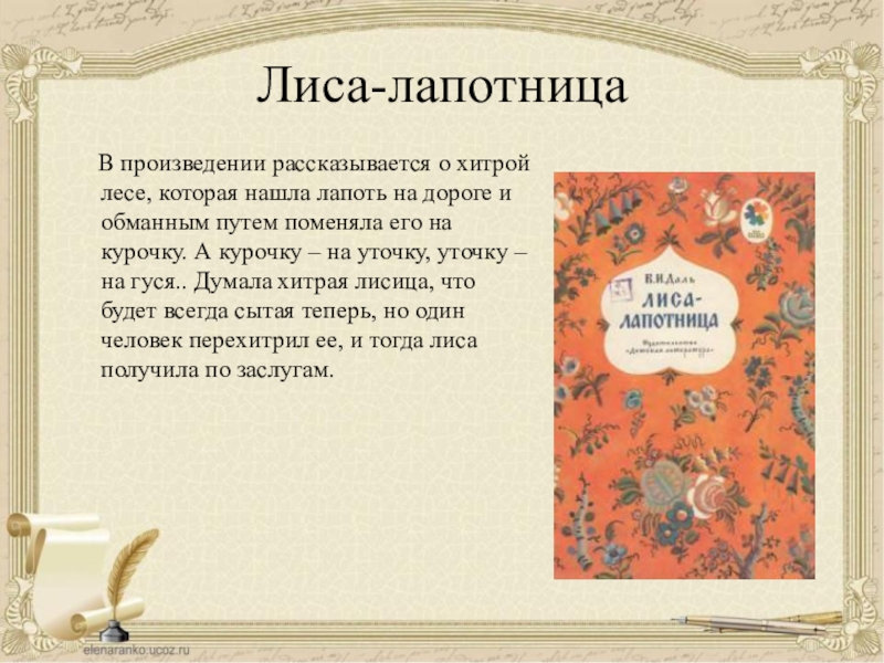 - Басня: Сказка, которая дает моральный урок, часто с использованием животных, мифических существ, сил природы или неодушевленных предметов, оживающих (братья Гримм, Эзоп)