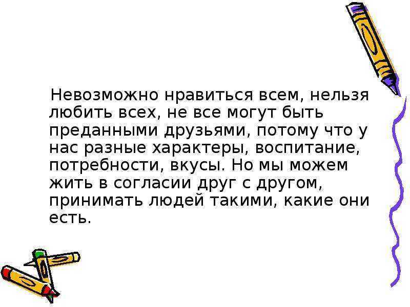 Если с вами всё в порядке — значит, найдутся люди, которым вы будете нравиться сами по себе. Не стараясь завоевать их признание, не лебезя, не заискивая. И эти люди — ваши люди. Это именно те люди, которые будут нравиться вам самим. Те люди, с которыми вам будет комфортно идти по жизни. Те люди, у которых вы сможете учиться и которых сможете учить.