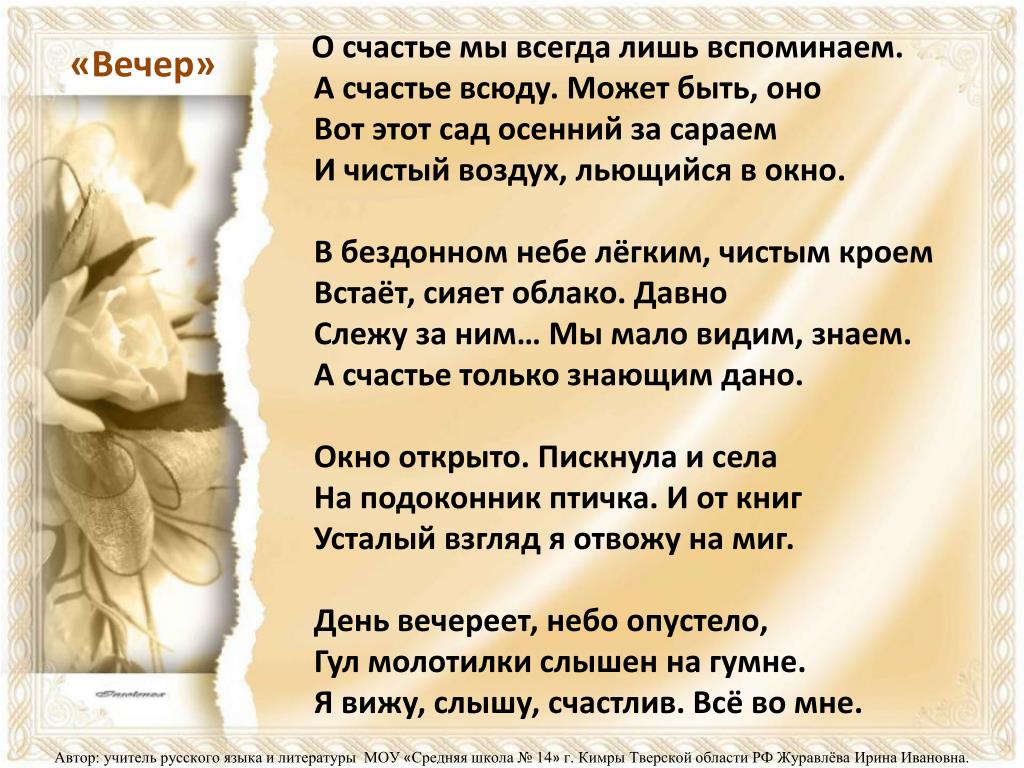 Итак, тема стихотворения — вечная тема счастья. Тема эта закреплена и кольцевой композицией (о счастье — счастлив). Но почему же стихотворение называется «Вечер»? Не проще ли было бы назвать его «Счастье»? Нет. Тогда бы не осталось поэтической загадки. Пусть маленькой, но загадки.
