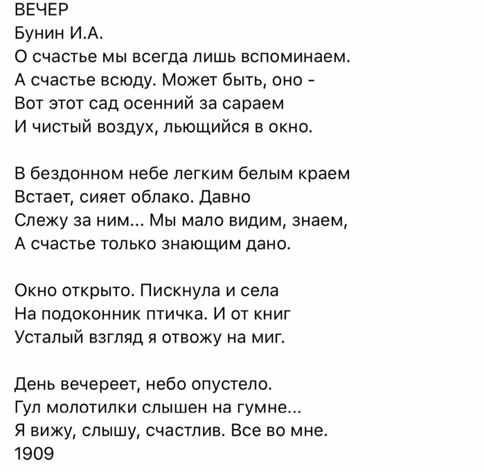 Поэзия И. Бунина удивительно лирична и насыщена философскими размышлениями. Поэт и писатель обладал тонко чувствующей душой, открытой для восприятия всего богатства окружающего мира. Бунин бесконечно любил русскую природу, ощущал свое единство с ней. При этом он оставался очень одиноким человеком. Он никого не допускал в свой внутренний мир. В 1909 г. он написал стихотворение «Вечер», в котором отразил свои размышления по поводу простого человеческого счастья.