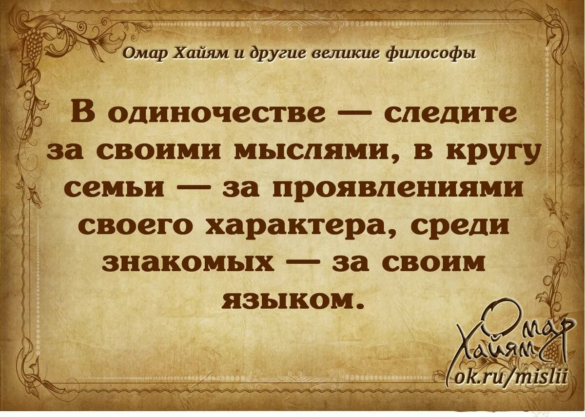 Сентенция Хайяма имеет смысл лишь в ситуации весьма ограниченного круга общения. Но тогда это не философская сентенция (не совет мудро прожить), а сентенция по случаю, ситуативная, имеющая сугубо частный характер. К советам мудро прожить она никак не может быть отнесена.