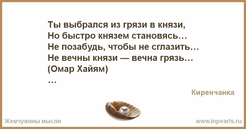 Ты выбрался из грязи в князи, но быстро князем становясь… Не позабудь, чтобы не сглазить…, не вечны князи — вечна грязь. — Омар Хайям.