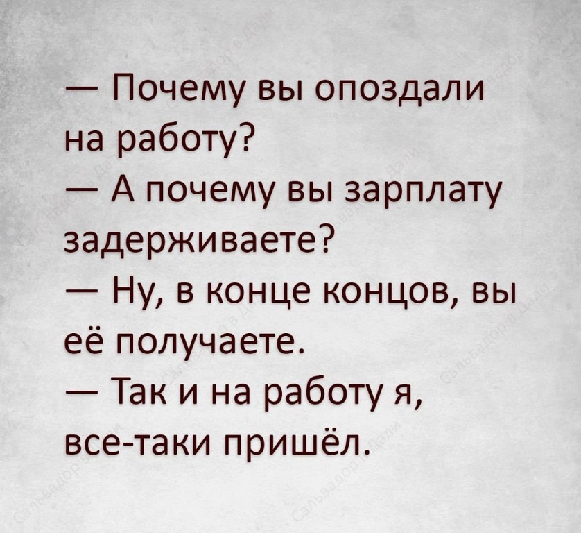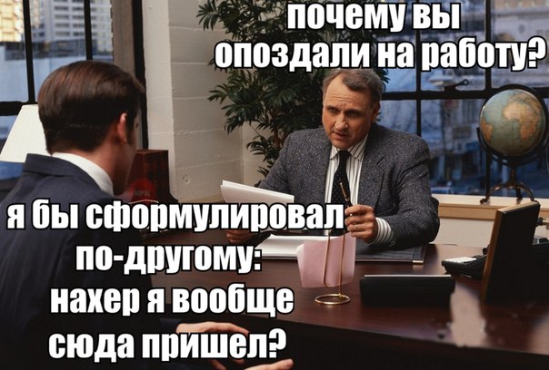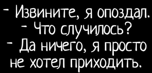 — Извините, я опоздал.— Что случилось?— Да ничего, я просто не хотел приходить.