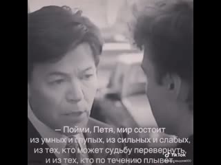 Пойми петя мир состоит из умных и глупых из сильных и слабых: — Пойми Петя, мир состоит из умных и глупых, из сильных и слабых, из тех, кто может судьбу перевернуть, и из тех, кто по течению плывет. Вот я смог, ты смог, а Коля этот, у него мечты нет! Не заработал он этой девушки, не заслужил!— Да разве можно счастье заработать?— Да можно! И нужно!