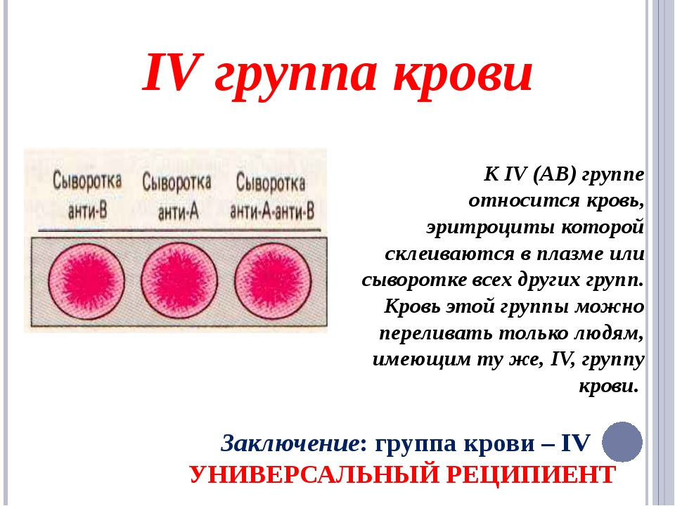 Группа крови определяется путем смешивания стандартных сывороток на предметном стекле с исследуемой кровью; последний будет принадлежать к группе, чья сыворотка не агглютинировалась.Если все четыре капли агглютинированы, анализируемая кровь относится к типу AB (IV). Любому человеку можно перелить кровь своей группы или типа O (I). Кровь типа O (I) можно переливать реципиентам всех групп, поскольку тип O (I) не имеет антигенов-агглютиногенов; агглютинины реципиента ни с чем не соединяются, и реакция агглютинации не происходит. Доноры типа O (I) называются «универсальными» донорами. Людям с кровью типа AB (IV) можно переливать кровь любой группы. Поскольку реципиенты AB (O) не имеют агглютининов, никакой реакции с агглютиногеном, даже с агглютиногеном чужеродной группы, не происходит.Кровь той же группы идеально совместима для реципиента, поскольку люди с типами A 1 или A 1 B, которые содержат высокоактивный агглютинин a 2 , могут иметь тяжелую реакцию на переливание крови групп A 2 или О (I). Переливание крови типа O (I) может вызвать серьезные осложнения, если переливать большое количество крови с высоким титром ɑ β антител в крови донора; агглютинины переливаемого типа O (I) могут агглютинировать эритроциты реципиента, в которых есть соответствующие агглютиногены.