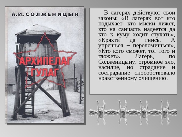Десятки тысяч людей забиты насмерть ворами. Сотни тысяч людей, побывавших в лагерях, навсегда соблазнились идеологией этих уголовников и перестали быть людьми. Что-то преступное навсегда вошло в их души. Воры и их мораль оставили неизгладимый след в душе каждого. […]