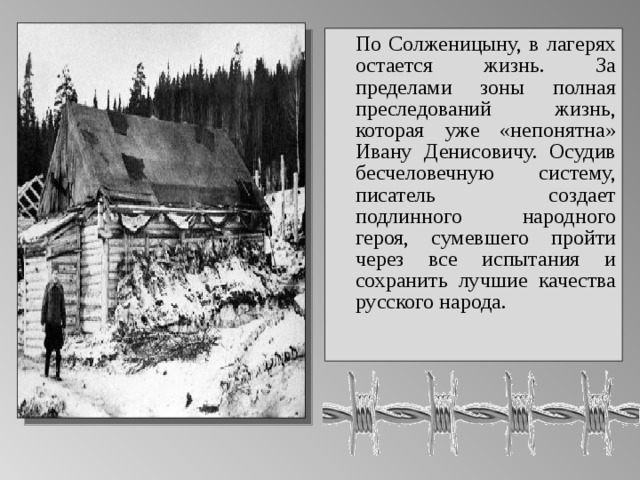 Молодой крестьянин, ставший заключенным, видит, что в этом аду сравнительно хорошо живут только уголовники, что они важны, что их боится всемогущее лагерное начальство. У преступников всегда есть одежда и еда, и они поддерживают друг друга.
