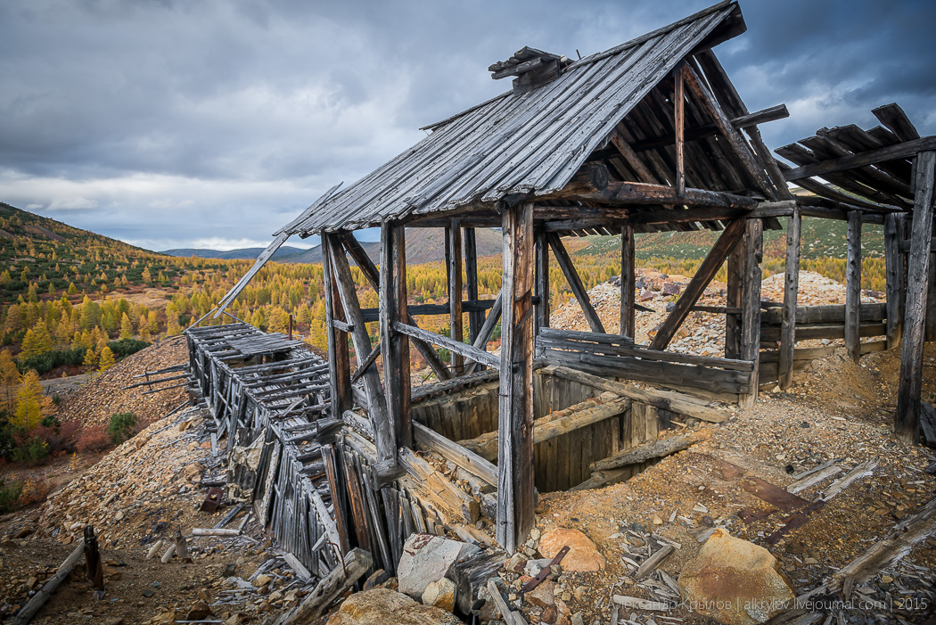Асфальт кончается. Редкие фуры, временные поселки старателей — цветные контейнеры с прорезанными окошками, руины Дальстроя: бараки, фабрики, котельные. Горы грунта по долинам перемытых драгами рек.
