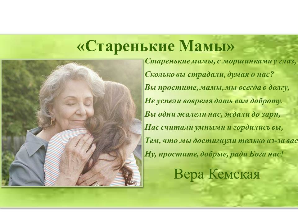 Мама дает тепло, мама покой хранит. Если тебе тяжело — мама в ночи не спит. Маму свою цени, не обижай напрасно… Память о ней храни, время над нами властно…