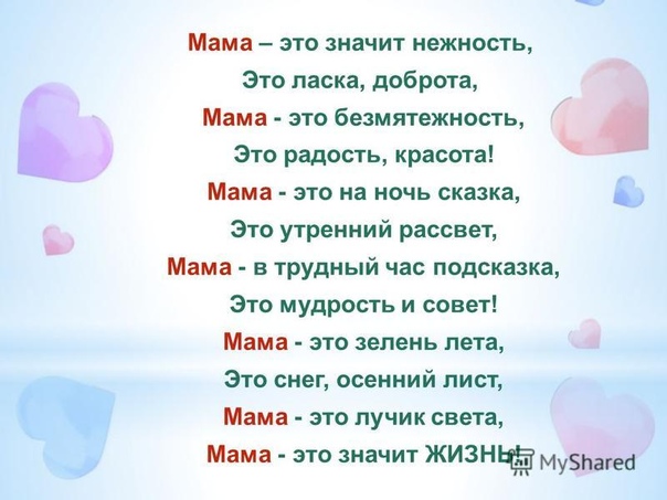 Без мамы очень тяжело, И меркнет всё вокруг. Родней на свете нет её. Она — твой близкий друг.