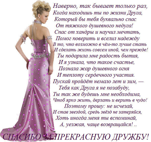 Хорошие друзья ближе дальних родственников. А вы у меня очень близкие, надёжные — замечательнейшие в мире! Вы — моя поддержка и палочка-выручалочка в любой затруднительной ситуации. Спасибо вам, друзья, за ваше добро и позитив, за помощь и нужные слова, за наши яркие, шумные праздники и тихие задушевные посиделки, за ваше сердечное тепло и родство душ!