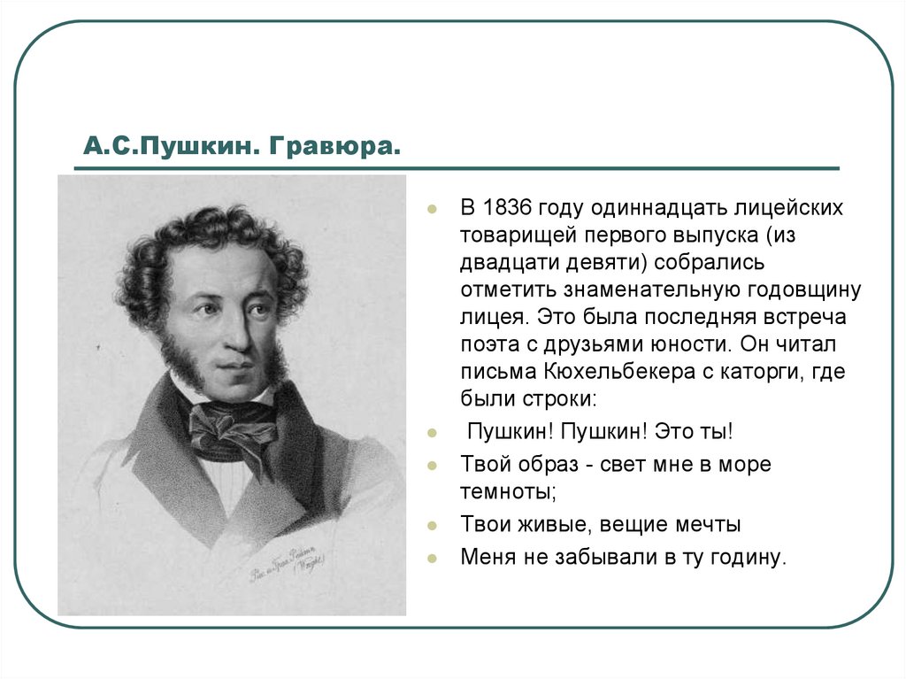 Годы учебы поэта в Царскосельском лицее наложили на него неизгладимый отпечаток. Время учебы – это время, когда Александр Сергеевич приобретал новых друзей, связь с которыми он пронес через всю свою, пусть недолгую, но яркую жизнь.