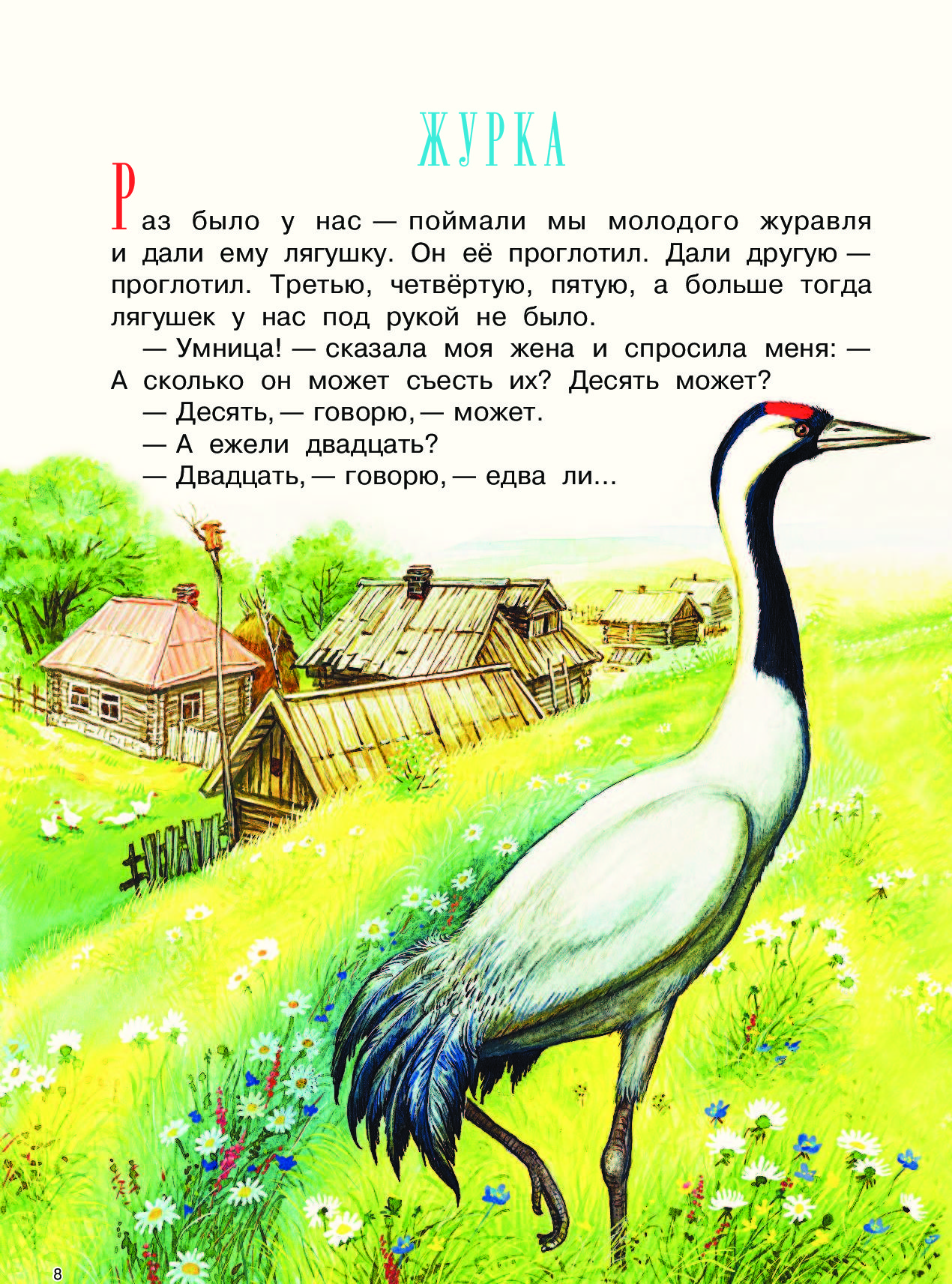 Раз было у нас — поймали мы молодого журавля и дали ему лягушку. Он её проглотил. Дали другую — проглотил. Третью, четвёртую, пятую, а больше тогда лягушек у нас под рукой не было.