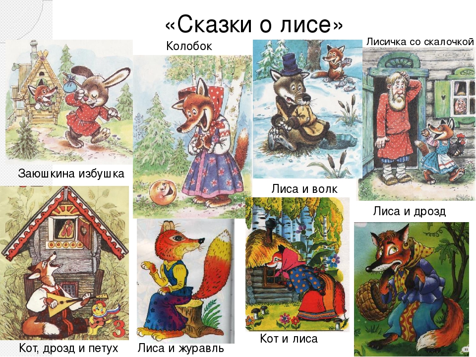 Интересна сказка про Котофея Ивановича. Один мужик привез кота в лес и оставил там. Его нашла лиса и вышла за него замуж. Стала она всем зверям рассказывать, какой он сильный и злющий. Волк и медведь решили придти на него посмотреть. Лиса предупредила, что лучше им спрятаться. Залезли они на дерево, а под ним положили мясо быка. Пришли кот с лисой, кот набросился на мясо, стал приговаривать: «Мяу, мяу…».