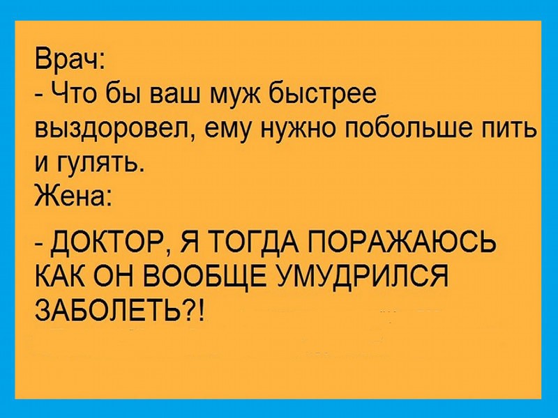 - Тебе лучше скорее выздоравливай и иди домой.Я слышал, твой муж слишком увлечен приготовлением ужина для твоей матери.