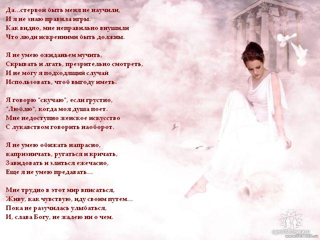 Мои стихотворения Чайная ложка В пустоту… Научи меня любить Мартовский кот Душа Признание Стихи дьявола Чайная ложка Он дарил ей любовь понемножку. За минуту до взрыва души, За секунду до вскрытия вен Я себе приказала: "Дыши!" Разлюбила тебя насовсем. Научи меня любить, Я прошу! Я умираю... Пусть удастся приоткрыть Хоть немного дверцы рая. Я не верю в чудеса, В сказки и в волшебных принцев, Серой жизни полоса - Знаю - до конца продлится... Научи меня мечтать О прекрасном, чистом, светлом. Я уже устала ждать Перемен - все неизменно... Без эмоций и без снов - Небо мне теперь не снится. Понимая, что все в этом мире игра, Не боясь провалиться под лед, Ты шагаешь по жизни назло всем ветрам, Ведь ты знаешь, ты – мартовский кот. Донжуан. Обольститель девичьих сердец. Чемпион – ты брал планку не раз. Улыбнешься и все, всем девчонкам конец… Обойтись можно даже без фраз.Душа Жила душа на свете белом, О! Как она была несчастна! Казалось ей, что в мире целом Она одна живет напрасно. Семью, друзей, любовь, удачу Она когда-то потеряла. Существовать - ее задача, А жить... и рядом не стояло. Душа отчаянно просила У неба дать ей счастья долю, Она так небеса любила, Что захотелось ей на волю. Туда, где нет вражды и воин, Туда, где жить хотелось всем бы. Мечтала убежать от боли Туда... повыше... прямо в небо. Ей небо отказать не смело, Да и душа легко решилась. Свой шаг последний сделав смело, Тот час же в небе очутилась. Ну что ж, сбылись ее мечтанья, Но, глупая, она не знала, Что от проблем и от страданий Она совсем не убежала. Душа на землю поглядела. Я могла бы сказать, но мне слов не найти, Собралась написать, только руки дрожат, Сердце громко колотится, бьется в груди, Ну а нервы - почти на пределе - жужжат. Ты такой sexy-boy...черт, зачем же так сразу? Ты прости за нескромность и пошлость меня. Но такого, как ты, не встречала ни разу, И не видела в снах эротических я. Я просто тень твоей души, Протяжный отзвук стонов сердца. Создатель сайта: Блинова Юлия Владимировна. Все авторские права защищены. 2007 г.