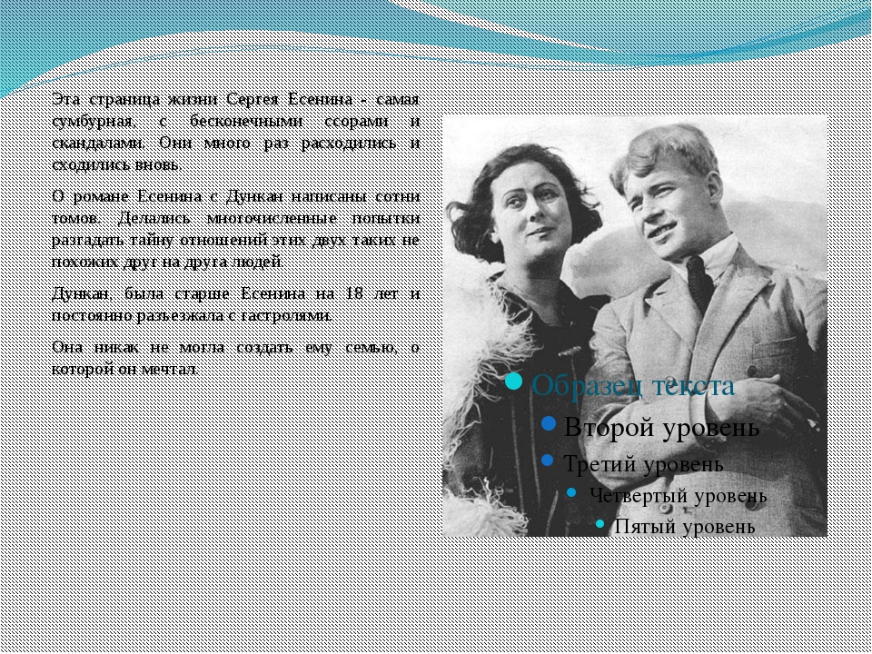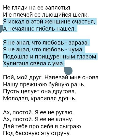 - «Пой же, пой. На проклятой гитаре…». Это рассуждение поэта о губительной природе любви и страсти, посвященное его возлюбленной, Айседоре Дункан. Однако в жизни его было много женщин, не обходилось и без измен. Все это – в атмосфере кабака, с привкусом раскаяния… Читать…