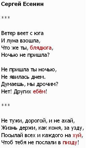 - «Сыпь, гармоника! Скука…Скука…». Самое знаменитое из нецензурных сочинений автора описывает эмоции лирического героя, проводящего вечера в кабаке в пьяном угаре. Он без стеснения высказывает свое отношение к женщине легкого поведения, открыто заявляя о своем неуважении к ней… Читать…