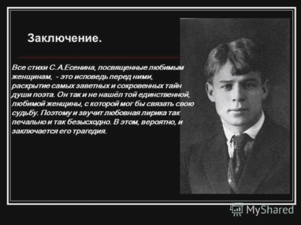 Стихи Есенина — это искреннее признание его романтической души, привлекающей прежде всего лучшим человеческим проявлением чувства.Привлекающая сила стихов Есенина именно в этой пронзительной искренности.