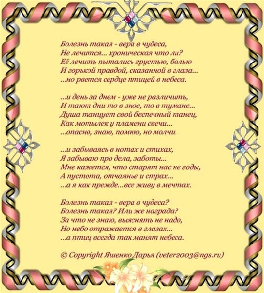 Твоё стихотворение тронуло меня, после прочтения ты был в моих молитвах. Уже почти девять месяцев, как я был болен, в больницах и вне их весь мой год восьмого класса. Каждый день в…