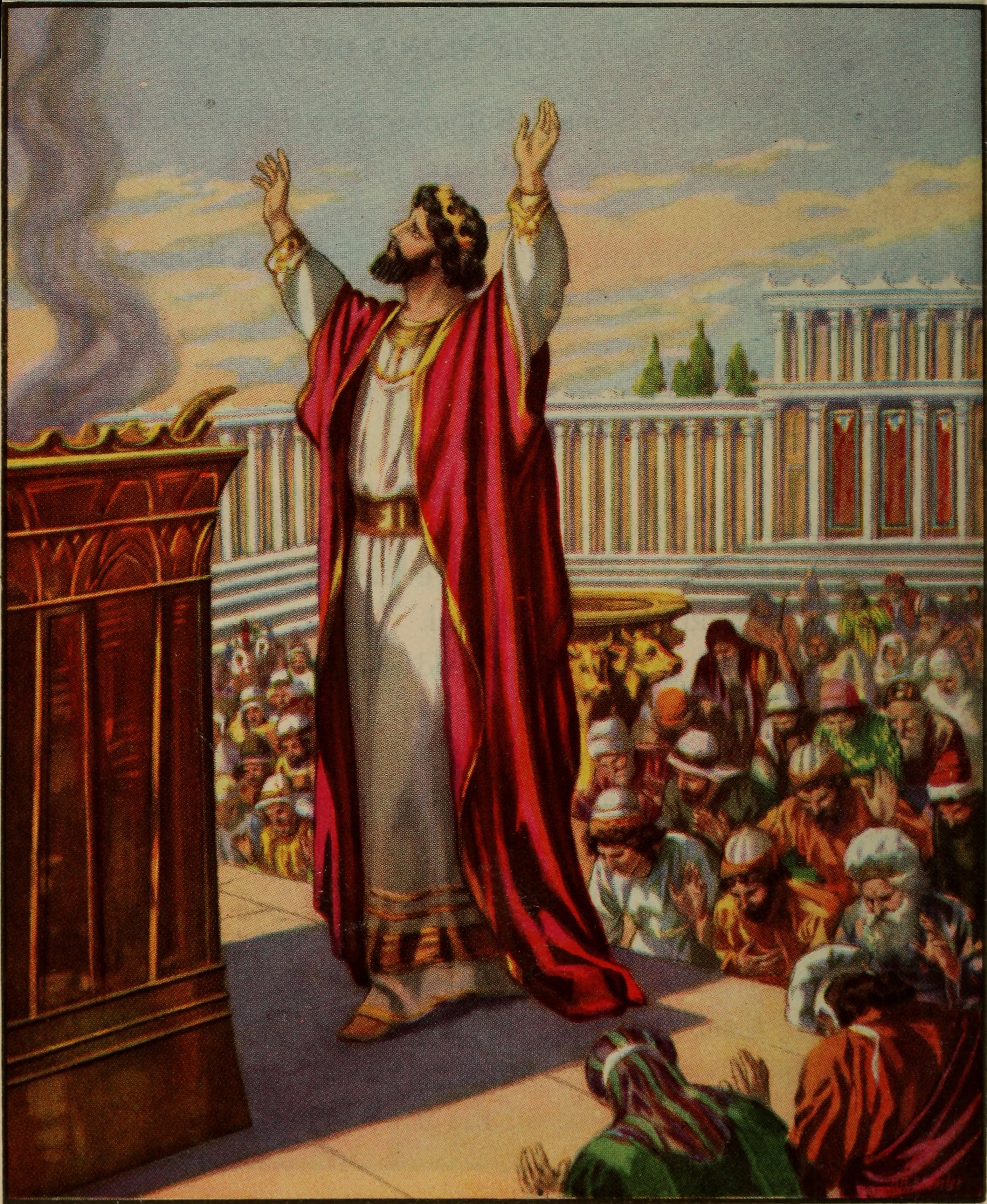 Как земная обитель Бога храм Соломона представляет собой модель Вселенной: на потолке видны звезды, на стенах – цветы и плоды, но, главное, в этом храме нет изображения Бога, в его святая святых стоит Ковчег Завета. Одна из функций царя – быть наместником Бога на Земле. Построив храм, Соломон как бы соединил свою власть с могуществом Бога. Дворец, где жил Соломон, и храм, где обитал Бог, вместе они показывали владычество Бога над страной и Соломона – над народом. После долгих лет строительства происходит освящение Дома Господня, особую роль в этом торжестве играет сам царь Соломон: он возносит пламенную молитву за весь мир и призывает Бога войти в храм и символически пребывать в нем.