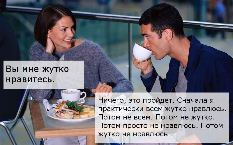 - Что вы кричите на каждом углу, что я вам не нравлюсь? Думаете, вы мне нравитесь, но я же никому про это не рассказываю – все и так от вас не в восторге.
