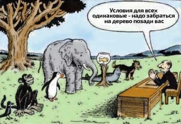 Так что на самом деле все гении. Но мы этого не узнаем, потому что мы работаем в рамках системы, которая судит о рыбах по их способности лазить по деревьям.