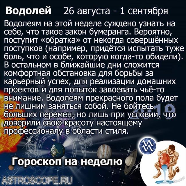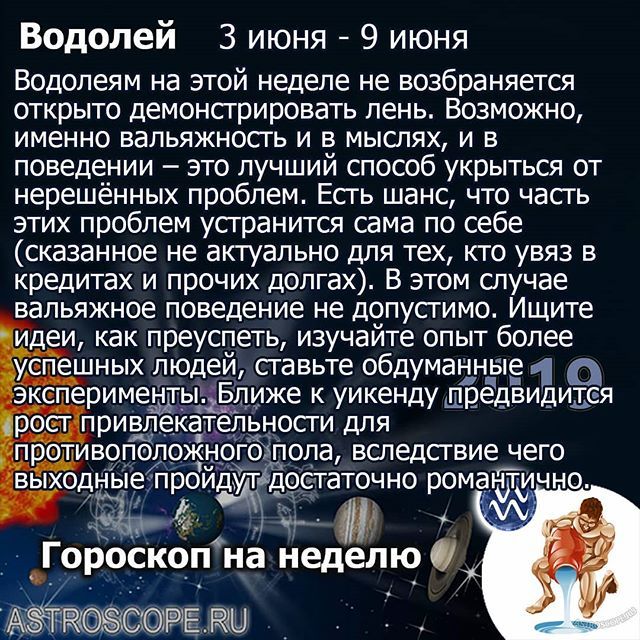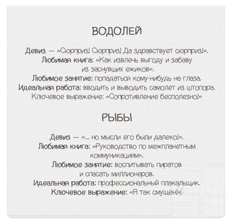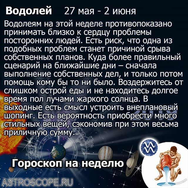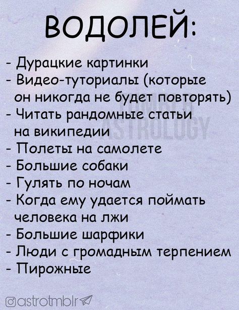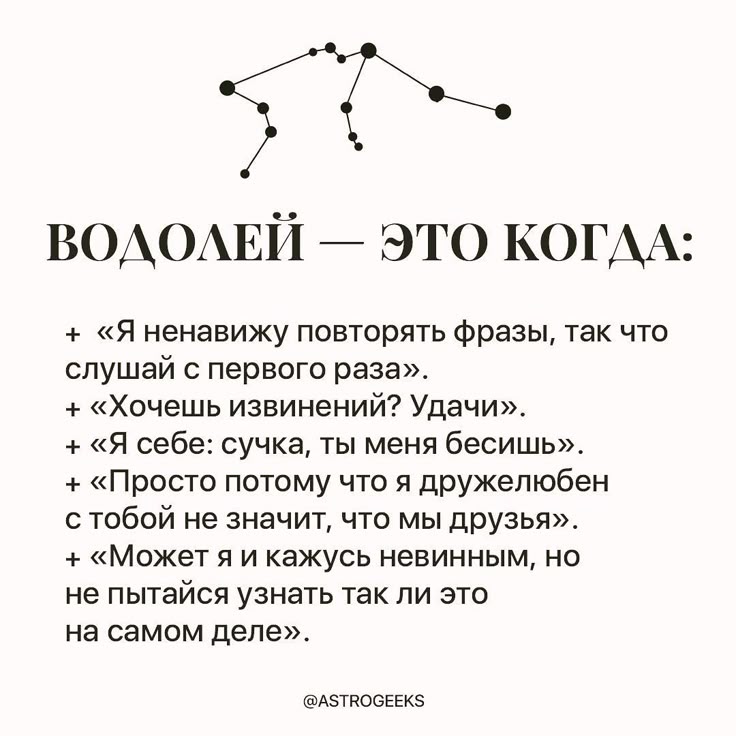 com/embed/1WbNflMUpGXwAP5BJ0″>Любить Водолей не умеет, что, в сущности, к лучшему, потому что если бы умел, то делал бы это так же, как и все остальное — то есть непредсказуемо. А так хотя бы понятно, что с ним нужно делать, чтобы он служил долго и приносил пользу: нужно бесконечно тыкать его палочкой. Отношения, в которых все понятно, Водолея категорически не устраивают, и он так не играет. А вот когда ему в голову летит тарелка, хотя «ничего не сделал, только зашел!»(с) — вот тогда ему интересно. И важно понимать следующее: если тебе вдруг не хочется устраивать Водолею ежедневные чудеса на виражах, он устроит их себе сам. И вариант «завести любовницу» он отметет сразу, как самый простой и очевидный, а потому — скучный. Но, честно говоря, лучше бы завел любовницу, потому что придумает он кое-что похуже, определенно — фантазия у него, как ты понимаешь, не только самая развитая в гороскопе, но и весьма инфернальненькая.