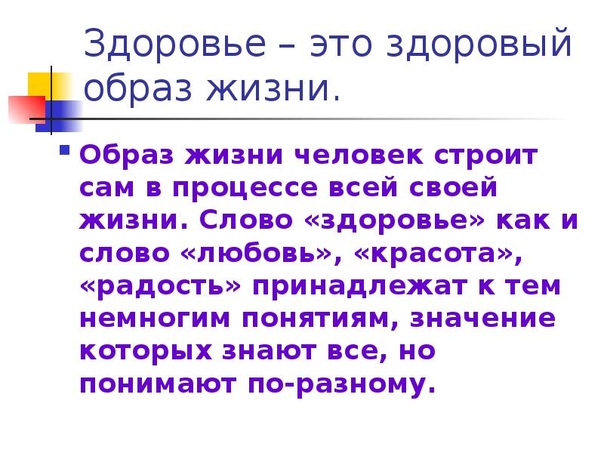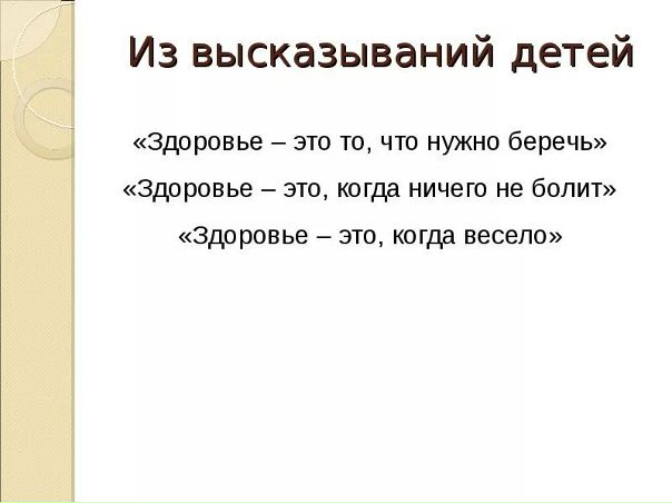 Здоровье человека не в сердце, не в почках, не в корнях, не в листве или спине. Конечно, слов нет, хорошо человеку, если у него все это тоже здорово, как у быков. Но самая суть чисто человеческого здоровья — это когда его неудержимо тянет сказать что-то хорошее другому человеку, как будто это даже закон: раз мне — то должно быть и всем хорошо! (автор: Пришвин М. М.)
