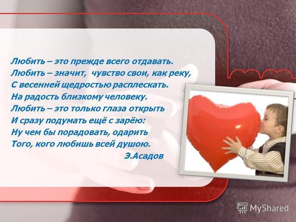 — Если вы хотите получить любовь, нужно просто дарить ее! Чем больше любви вы дарите, тем больше вы получите.