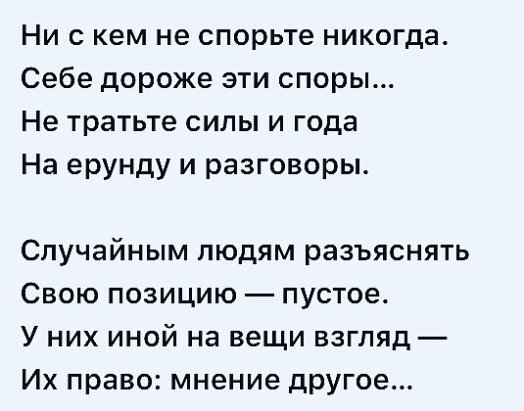 Если я считаю возможным скорректировать свои действия, я это сделаю. Если это невозможно, то ей придётся подстроиться под обстоятельства. Если подстраиваться она не хочет, значит, я не её мужчина, а она не моя женщина. Пусть действует, как считает нужным, только отдельно от меня. Автор: Александр Бирюков