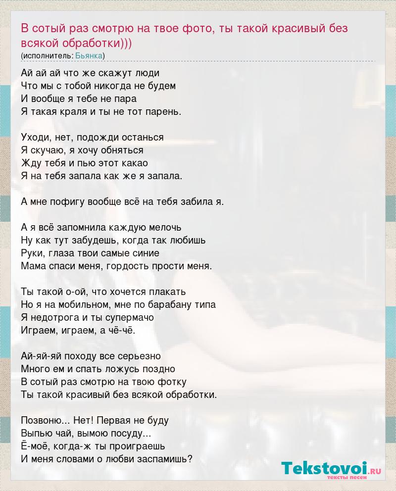 | Ночь, огни, и этот сильный, сильный дождь. Мы, одни, я точно знала, ты придешь. Не уходи, пожалуйста не сегодня. Не уходи, пожалуйста не сегодня. Не уходи… Не уходи… И как бы ни было, когда я пьяный, я рвусь. Не уходи… Я помню все твои секреты, которых их нет. Я снова выключу трек, перемкнуло, прости. Пожалуйста не уходи, я без тебя гибну, Я удалю все номера, этих тающих дам. Пожалуйста не уходи, я без тебя гибну, Я удалю все номера, этих тающих дам. Не уходи, пожалуйста не сегодня. We, alone, I knew you would come. Do not go, please do not today. Do not go, please do not today. Do not go away … Do not go away … And no matter how it was when I was drunk, I am torn. Do not go away … I remember all your secrets, which they are not. I back off track peremknulo forgive. Please do not go, I’m dying without you, I will remove all the numbers of melting ladies. Please do not go, I’m dying without you, I will remove all the numbers of melting ladies. Do not go, please do not today. Смотрите также:Тбили Тёплый — Жирная |
