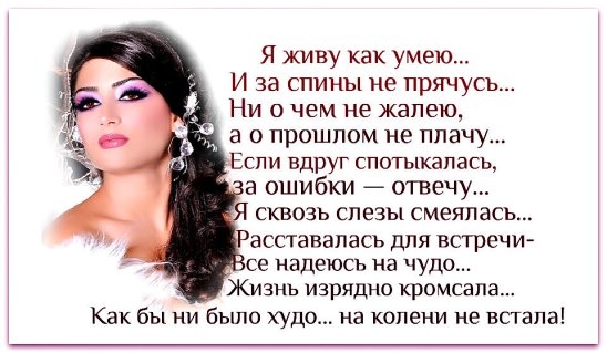 Я живу, как могу! Никому не мешаю! За ошибки свои — лишь себя осуждаю… Да и то….. не всегда,…. и не очень глобально… Невозможно прожить свою жизнь идеально !!! Невозможно так жить, чтоб всегда наслаждаться! Невозможно всегда и для всех улыбаться !Можно лишь попытаться её изменить!Научиться никого ни о чём не просить! Можно просто принять, что даётся судьбою..… НО ВСЕГДА И ВО ВСЁМ ОСТАВАТЬСЯ СОБОЮ!!!!!!!! — Спрашивалка Я живу, как могу! Никому не мешаю! За ошибки свои — лишь себя осуждаю… Да и то.