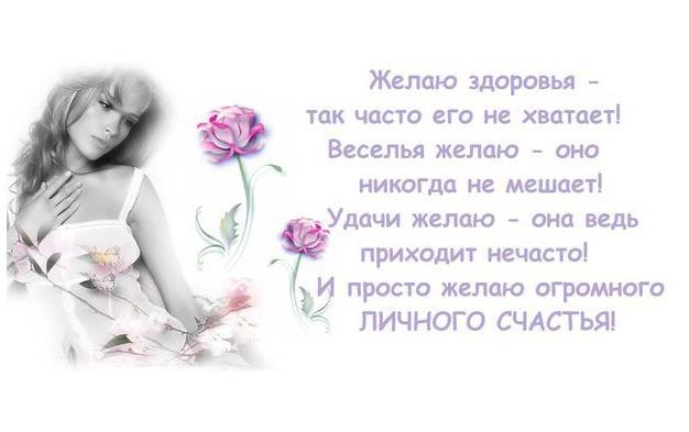 Добро безмерно, как водаБездонного колодца.Будь добрым к людям — и добро Всегда к Тебе вернется В День рожденья Твой сегодняГоды можно не считать,В этот самый день счастливый Мы хотели б пожелать: Пусть морщинки, но от смеха. Не беда и седина. Пусть слезинки, но от счастья Тебе сопутствуют всегда. Чтобы в жизни улыбались Твои ясные глаза, Чтобы счастье и здоровье Были спутником всегда. Пусть будет все, что в жизни нужно,Чем жизнь бывает хороша:Любовь, здоровье, верность, дружба И вечно юная душа. Желаю счастья и добра,Чтоб жизнь, как день была светла,Чтоб только радость, без тревог, Переступала Ваш порог. ![]() Желаю здоровья, бодрости,Огромной женской гордости,Уменья быть красивой, Казаться всем счастливой. Любить без вздохов, вечно, Растить детей сердечно. И жить не годы, а века, И не стареть Вам никогда. Желаю успехов, желаю удачи,Легко отдыхать и трудиться с отдачей.Чтоб радость в судьбе Твоей чаще встречалась, Чтоб все выходило и все получалось. Пусть солнце светитВ День рожденьяИ голубеют небеса. И пусть любовью окружают Родные, близкие, друзья. Пусть в меру радость,Пусть в меру грусть.Мороз и снег пусть будут в меру, Но только счастье будет пусть Всегда бездонным и безмерным. Добрых слов о Тебе можно много сказать:Справедлива, добра, терпелива.В этот день от души мы хотим пожелать Жизни долгой, полной, счастливой Желаю здоровья, тепла и добра,Чтоб бед, неудач отступила пора,Чтоб жить не тужить до 100 лет довелось, Пусть сбудется все, что еще не сбылось От всей души, с поклоном и любовьюМы Вам желаем долгих, долгих лет,Большого счастья, крепкого здоровья. Хороших дел и трудовых побед. Что пожелать Тебе, не знаю!Повторяться снова не хочу.Просто нежно Тебя обнимаю. «Будь счастливой» — на ухо шепчу. Пусть жизнь Твоя в труде продлится,Пусть бодрость духа сохранится,Пусть стороной пройдет беда, Пусть в Твои двери не стучатся Болезнь и старость никогда. Пусть эта замечательная датаВ душе Твоей оставит добрый след,Желаем мы всего, чем жизнь богата: Здоровья, счастья, мира, долгих лет. День рожденья -хорошая дата,Но немножко грустно всегда.Потому что летят незаметно Наши лучшие в жизни года. День рожденья — особая дата, Этот праздник ни с чем не сравнить, Кто-то умный придумал когда-то Имениннику радость дарить. Радость встречи, улыбки надежды, Пожеланья здоровья, тепла, Чтобы счастье безоблачным было, Чтоб успешными были дела. Поздравляя с этой славной датой,От всей души хотим мы пожелатьЕще полвека или даже с гаком По жизни бодро, весело шагать. Шагать уверенной походкой, Путь впереди еще большой. Потери будут и находки, Ну, а мы всегда с Тобой. Все хорошее пусть запомнится,А задуманное — исполнится.Пусть глаза счастьем светятся, Пусть хорошие люди встретятся. Без лишних слов, без лишних фраз,С глубоким чувством уваженьяПозвольте нам поздравить Вас В день светлый Вашего рожденья. Что пожелать Вам в этот день, Каких же благ, какого счастья? Чтоб никогда не унывать, Не знать болезни и несчастья. Чтоб Вы не знали никогда Ни огорчений, ни печали, Чтобы товарищи, друзья С улыбкой всюду Вас встречали. Любите жизнь, любите вдохновенье.Пусть не страшат Вас в будущем года.Пусть лучше будет Ваше настроенье, А грусть покинет раз и навсегда. Не в том беда, что множатся года,Что волосы от времени седеют,Пусть будет молодой душа, А души молодые не стареют Не жалей нико