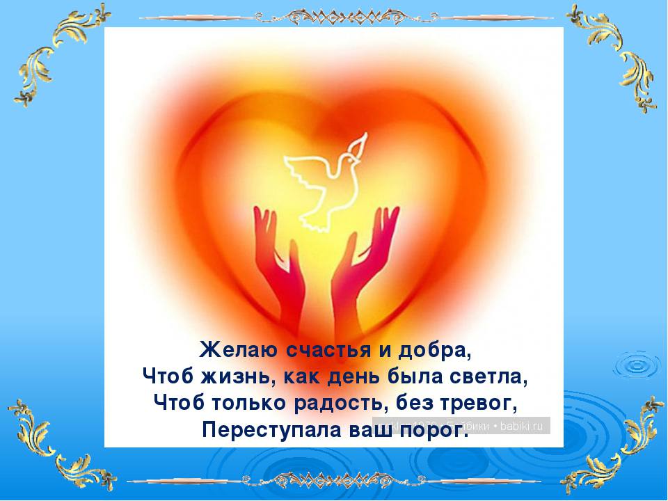 Быть везде всегда красивой. На работе лишь успеха, Дома — радости и смеха. Чтобы ласка сердце грела И ничто бы не болело, Все невзгоды забывались, А мечты бы все сбывались. Желаю жить и не тужить,Беду и горе пережить.И быть такой же доброй, милой, Любить самой и быть любимой. Желаю быть загадочной, желанной,Самой нежной и долгожданной,Самой любимой и самой красивой, Самой-самой на свете счастливой. Хотим, чтоб Ты была счастливой,Хотим, чтоб Ты была красивой.Веснушки — тоже украшенье, Носи их гордо, без стесненья. От всей души, без многословья,Желаю счастья и здоровья.Будь Ты милой и красивой, И, конечно же, счастливой! С каждым годом Ты нужнейИ в семье, и на работе.Жизни смысл твоей — в заботе, Близким радости дарить И взамен счастливой быть Пусть юбилей несет лишь счастье,Ни капли грусти, ни одной слезы. Душевного богатства и здоровья Желаем мы от всей души. Годы — не всегда лихое бремя,Жизнь-плутовка тем и хороша.Над душой не властно даже время, Если настоящая душа Пусть годы не уносят красоту,Когда коснется ниточка седая.Все сохрани: душевность, доброту — И оставайся вечно молодая. С юбилеем Тебя поздравляем,Желаем здоровья, счастья, добра.Если время виски запорошит — То это совсем-не беда. Пусть сердце Твое молодеет И не стареет никогда. Мы Тебе сегодня пожелаемЗдоровья, бодрости на долгие годаБудь таким, каким Тебя мы знаем — Добрым и отзывчивым всегда. Много слов хороших хочется сказатьДоброго здоровья в жизни пожелатьСердцем и душою вечно не стареть И прожить на свете еще много лет. Любой юбилей — это чуточку грустно,Ведь это из жизни уходят года.Но если года эти прожиты честно — Не надо об этом жалеть никогда. ![]() Желаю много счастья и света,Много теплых и радостных дней.Пусть душа Твоя будет согрета Добрым чувством родных и друзей Неслышно пролетают годы,Как птиц небесных караван.И мчится время незаметно — Ты не грусти по пустякам. Не грусти, заметив перемены, Когда морщинку лишнюю найдешь. Дни новые приходят дням на смену, И каждый возраст по-своему хорош. Ни шагу к старости!Ни часу в горести!А только в радости! И только в бодрости! Тебе желаем мы здоровья и удачи.Пусть рядом будут радость и мечта.И пусть из всех мужских моральных качеств В Тебе сильнейшим остается доброта. Желаю легких, светлых дней,Теплого внимания друзей.С любым делом справиться И никогда не стариться. Сегодня и всегда Тебе желаем счастья.Храни Тебя судьба от мрака и ненастья,От злого языка, от тяжкого недуга, От умного врага, от мелочного друга. И дай Тебе Господь, коль это в его власти, Здоровья, долгих лет и много-много счастья Живи на свете долгий век,Родной, любимый человек. Живи без грусти, не болей, Душой и сердцем не старей. Живи счастливо и светло, С Тобой спокойно и тепло Желаю Вам не знать закат печальный,Желаю Вам не знать любви прощальной,Желаю в мыслях, чувствах не страдать, Желаю счастья в жизни не терять. Есть в мире много пожеланий,Их всех не перечесть.Тебя я просто поздравляю, Люблю такой, какая есть! Желаю много светлых дней,Хороших, преданных друзей,Здоровья, счастья и любви На твоем жизненном пути. Будь счастлива, хоть трудно будет иногда,Любима будь — любовь спасает нас всегда,Будь молодцом, в любых условиях держись, Ведь что бы ни было — прекрасна эта жизнь Пусть радостью глаза Твои искрятся,Улыбка никогда не сходит с губ.Умей, когда и трудно, рассм