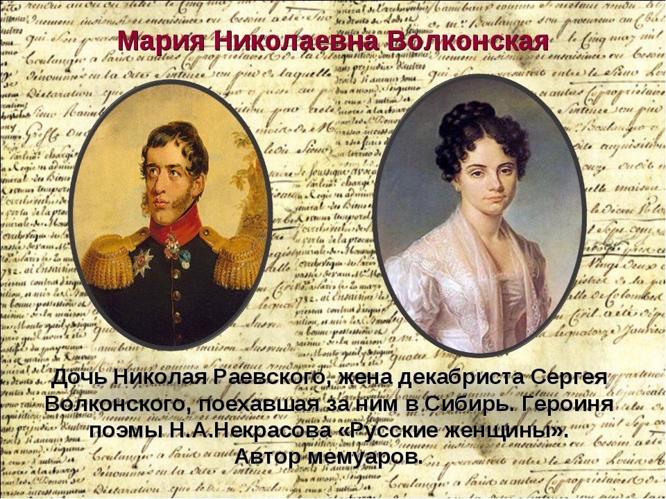 - Урожденная Раевская, дочь генерала, героя 1812 г Н.