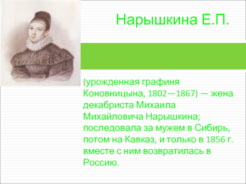 - Урожденная графиня Чернышова, последовав в Сибирь за своим мужем Никитой Михайловичем Муравьевым, рассталась с двумя дочерьми и сыном, передала их бабушке. Привезла послание А.С. Пушкина декабристам. «У нее было горячее сердце, редкое благородство проявлялось в каждом ее поступке, она восторгалась мужем и боготворила его».