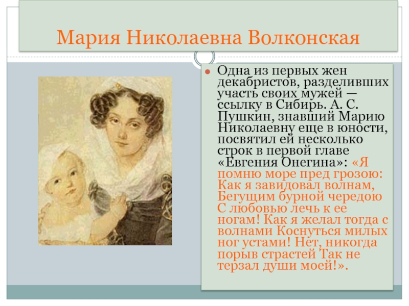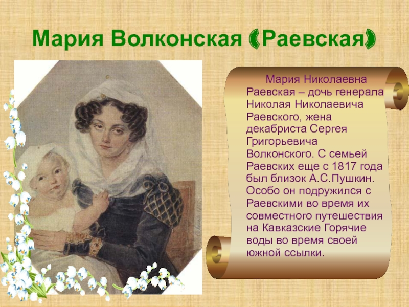 - Ранняя юность Марии Николаевны ознаменована встречей с А.С. Пушкиным в годы его южной ссылки, их совместная поездка в Гурзуф, где поэт останавливался в доме Раевских. Пушкин посвящал ей свои стихи, а в романе «Евгений Онегин» -лирическое отступление: